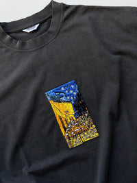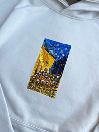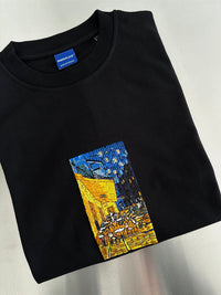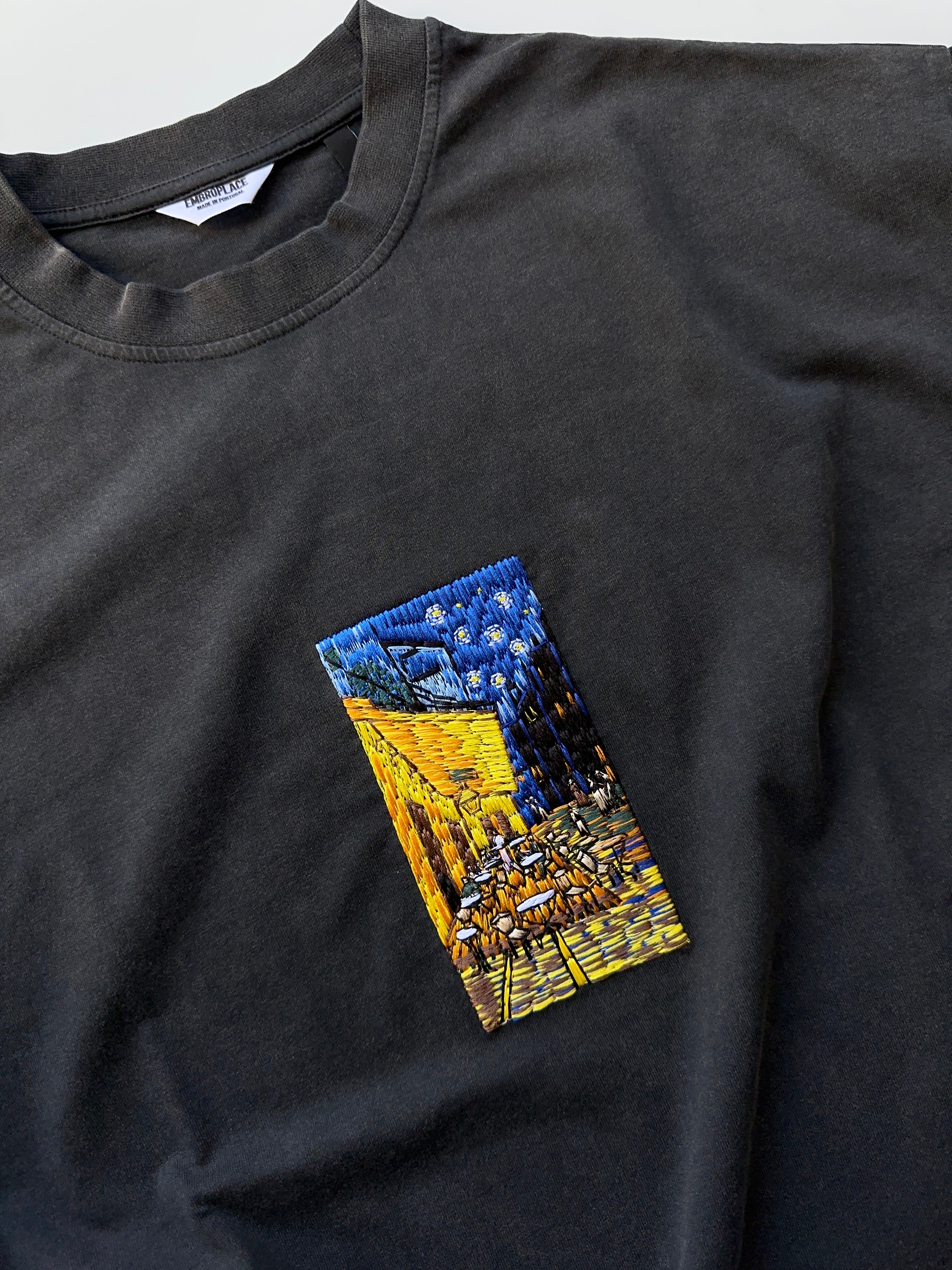This embroidery design, based on Vincent van Gogh’s "Café Terrace at Night," shows a cozy café on a cobblestone street in Arles, France, under a starry sky. The warm yellow glow of the lamps contrasts with the deep blues and purples of the night, creating a sense of comfort and romance. The empty tables and softly lit buildings capture the charm of a quiet evening in the city.