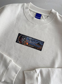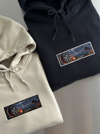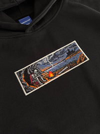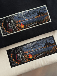 Embroidery in dark fantasy style: a weary knight rests by the fire, its flames tearing through the darkness and casting reflections on the heavy armor. In the distance loom the shadows of a ruined world — harsh cliffs, a grim sky, and rumbling thunder. In this silence there is both calm and the foreboding of a new battle — as if the night itself is holding its breath, awaiting the outcome of the eternal struggle between light and darkness.