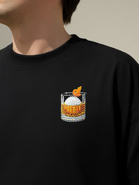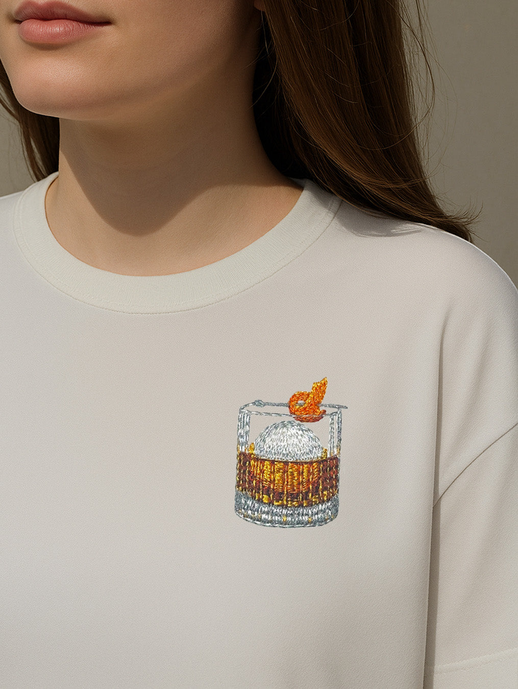 A classic tumbler glass embroidered with warm amber and golden tones to represent the whiskey base. Inside — a large round ice cube in silver-white thread adds contrast and dimension. The orange peel garnish curls elegantly on top. The glass features detailed stitching to mimic cut crystal texture. The design is rich, structured, and timeless — reflecting the essence of a true Old Fashioned.