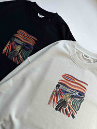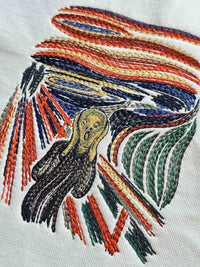Introducing the new machine embroidery design "The Scream," based on Edvard Munch’s iconic 1893 painting. Known for its raw expression of angst and despair, the design features a solitary figure on a bridge, seemingly screaming, set against a swirling backdrop and vivid red sky.