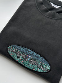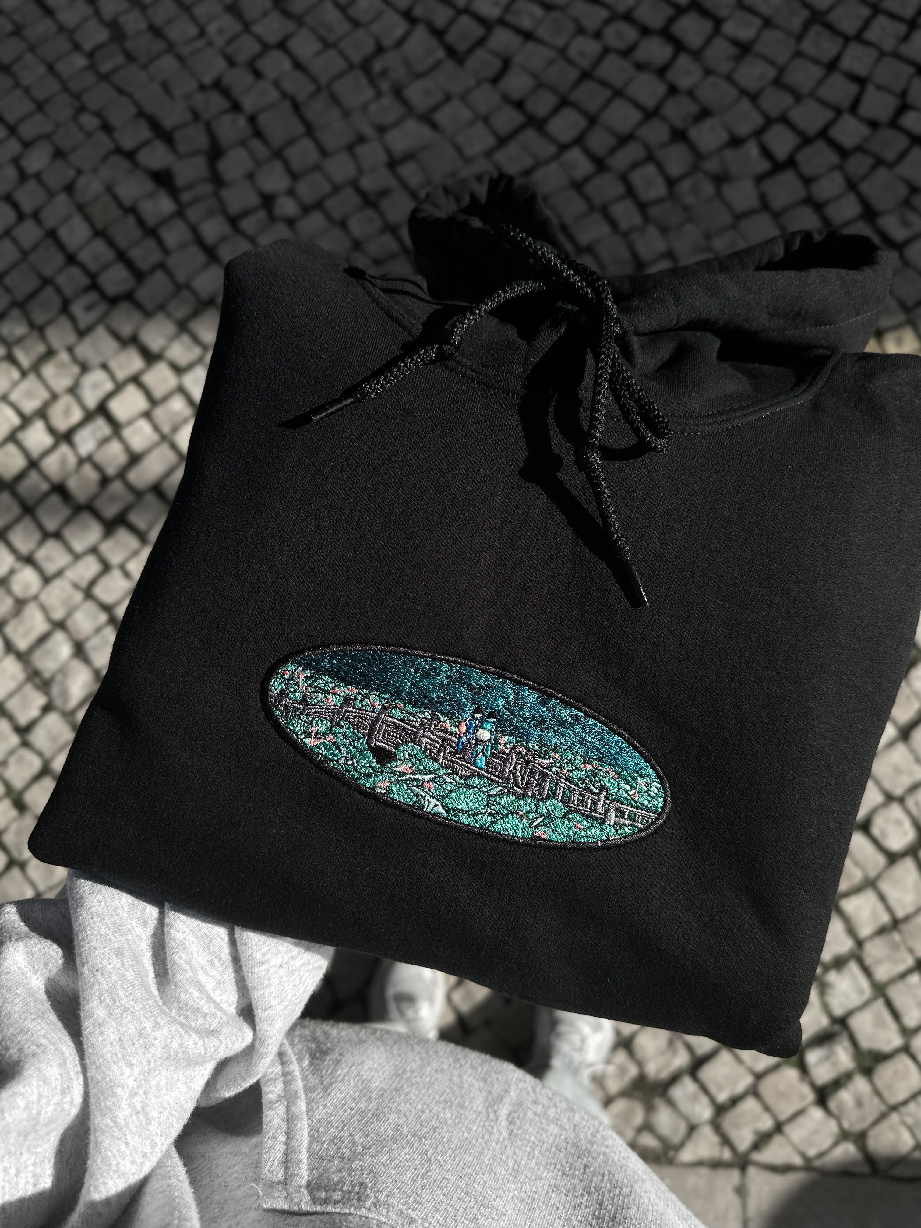 The design features two geishas walking across a bridge surrounded by lush greenery, blending nature, spirituality, and Japanese cultural heritage into a single, harmonious scene.